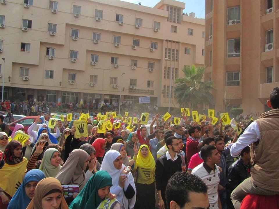رفع الطلاب لافتات تطالب بالافراج عن المعتقلين من زملائهم الذين القى القبض عليهم فى مسيرات سابقة , كما هتفوا مطالبين بالافراج عنهم, واستقبل الطلاب والد احد الطلاب الذين قتلوا وهو ” عبد الرحمن عابدين” وأحد المفرج عنهم “عبد الرحمن صفوت” الذى قضى 90 يوم داخل سجن ابو زعبل .