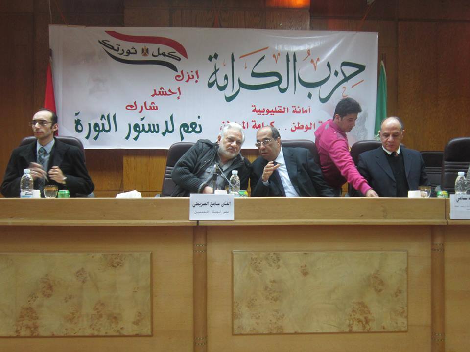 شهدت مساء اليوم الخميس محافظة القليوبية اقامة امانة حزب الكرامة ببنها مؤتمرا بعنوان ” أنزل ..أحشد.. شارك- نعم لدستور الثورة ” وذلك بمكتبة مصر العامة بحضور محمد عبد العزيز عضو لجنة الخمسين ،والفنان سامح الصريطى ،ومحمد سامى رئيس حزب الكرامة ،وحامد جبر رئيس تحرير جريدة الكرامة ، وسامى عبد الوهاب عضو الهيئة العليا لحزب الكرامة بالقليوبية.