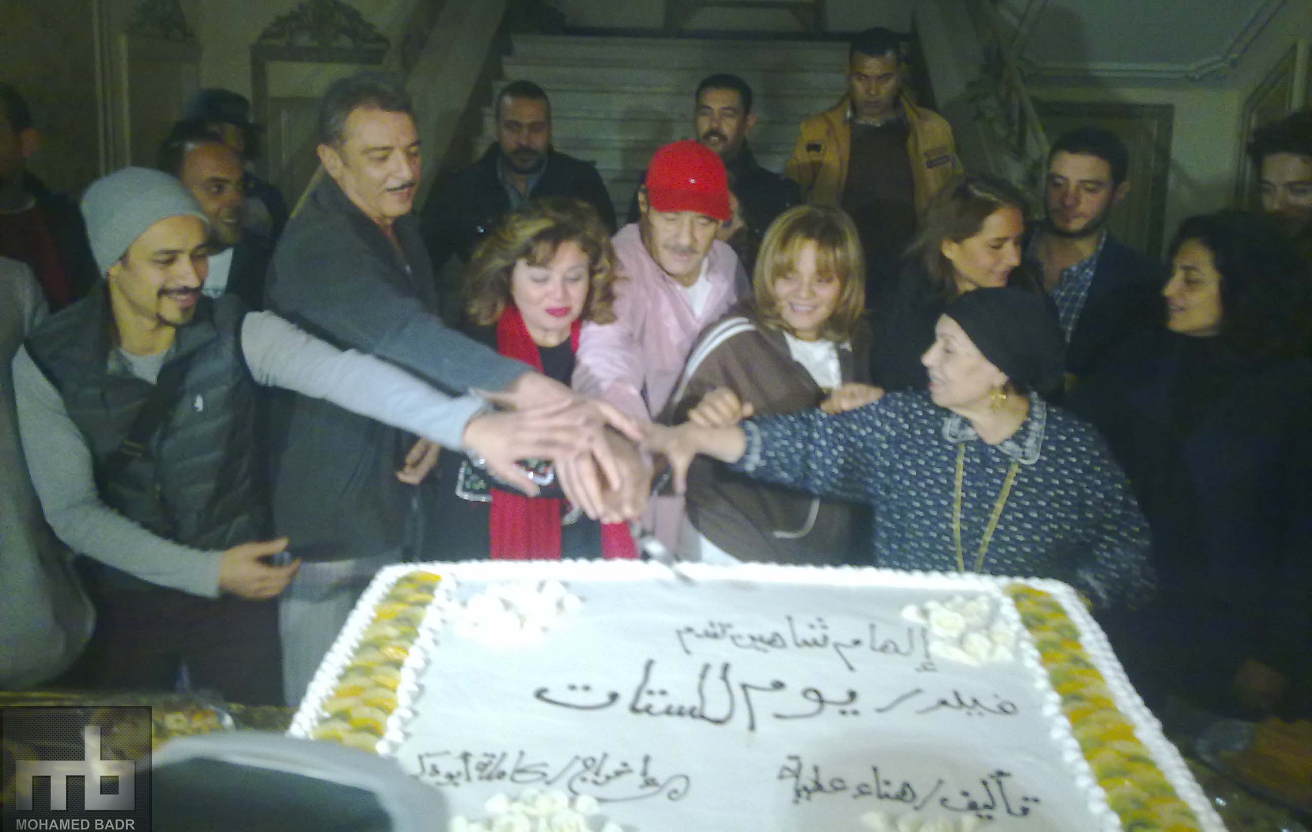 وبعد انتهاء النجمة / الهام شاهين من تصوير مشهدها مع النجم / محمود حميدة ، بدأ الاحتفال وتم تقطيع التورتة واخذ صورة تذكارية مع كرو عمل الفيلم على سلم البلاتوة ، وكان لنا مع منتجة الفيلم وبطلته الفنانة /الهام شاهين هذا الحوار الصحفي والتي قالت به : انا بسجل معاك بلبس الشخصية ومكياجها وعياطها ، فيلمنا فيه ست نساء كل واحدة فيهم عندها مشكلة وكل مشكلة فيهم تعمل فيلم واكيد مفيش مشكلة لمرأة الا ومرتبطة برجل فاكيد فيه معانا ابطال رجال وعندهم قضايا مهمة جدا فاحنا طارحين قضايا المجتمع عموما ، شخصيتي معتمدة على الناس اللي بتأخذ بالمظاهر وما بيدوروش في عمق الانسان ده ايه ، فالمسألة مش مسألة مظهر مش كل حد متغطي لابس حجاب او نقاب بالضرورة يكون روحانياته عالية واخلاقه كويسة ومتدين حقيقي ومش كل اللي مش عامل ده انه يبقى العكس ، فشخصيتي بتتظلم اوي شكلها متحررة بروج احمر وانها ملفتة للنظر فالناس دائما بتحس ان فيه وراها حاجة فيه شيء يقلق ، مع انه بالعكس فيه ناس تقلق ومظهرها لا يدل على ذلك ، لكن هي الوحيدة الصريحة والواضحة ، الفيلم مش بطولة فردية ولكنه بطولة جماعية وانا احد عشر ابطال موجودين فيه ، وعن توقعاتها لايرادات الفيلم والمنافسة في السوق عند نزوله قالت : توقعاتي اني هخسر لما ينزل السوق لانه فيلم محترم والافلام المحترمة بتخسر ومع ذلك مصرة ان السينما المصرية اللي اديتني حاجات كتير حلوة في حياتي اني انا ارد لها الجميل ، والفيلم مش هينزل قبل شهر فبراير ، وعن احوال البلد السياسية قالت :عايزين بسرعة يبقى عندنا رئيس عايزين السياحة ترجع والبلد يكون فيها استثمارات ، كفاية بقى ، لازم نفكر في بكرة ، وانا كل حاجة في الدستور الجديد موافقة عليها لاني خلاص عايزة عجلة الحياة تمشي ومعنديش حاجة اعترض عليها فيه