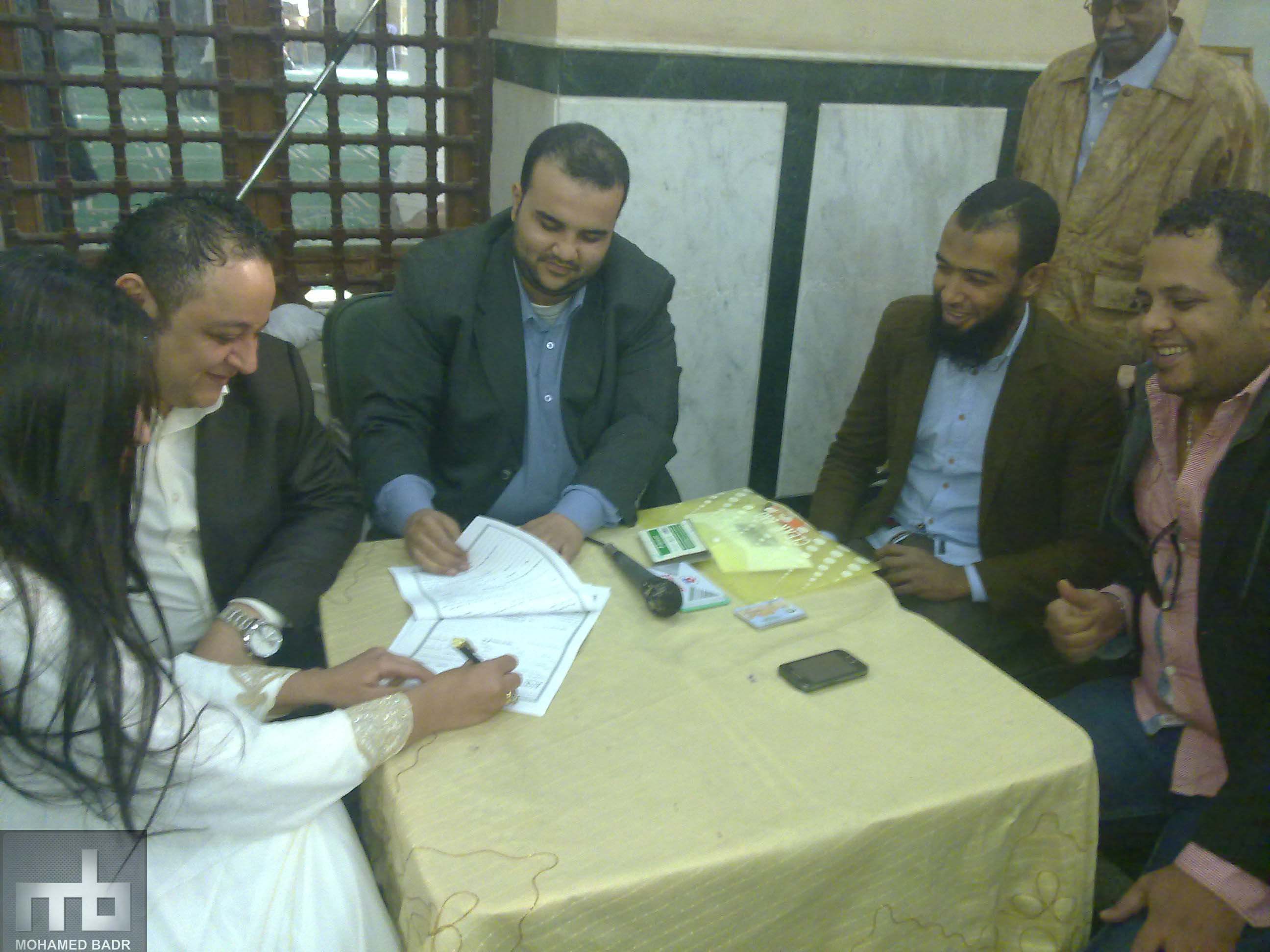 قبل حضور المأذون اخذ العروسان الصور التذكارية مع بعض من اقاربهما وثم جاءت لحظة كتب الكتاب والتوقيع على قسيمة الزواج والبصم عليها وتوقيع الشهود وكان من بينهم الفنان / احمد نصار صديق العروسن ، ثم تلا كلا من : العريس ووكيل العروسة قسم الزواج وقد دعا المأذون لهما وآمن الحاضرين من بعده واحتفل الحضور بهم بالغناء لهم والزغاريد وتوزيع الشوكلاتة والعصائر واخذ الصور معهم وتمنوا لهم حياة كريمة وزفاف سعيد في القريب العاجل