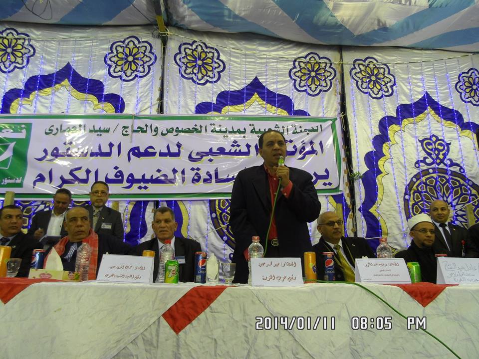 فى مؤتمر جماهيرى حاشد لم يسبق لة مثيل اقامت القوى السياسية والشعبية بمدينة الخصوص بالقليوبية مؤتمرها للتعريف بالدستور حيث ضم نخبة من الكوادر السياسية ورجال الدين حيث قام بتنظيم المؤتمر جودة على حسن منسق عام اللجنة الشعبية بالخصوص وشارك فى التنظيم طارق الشاذلى المنسق الاعلامى باللجنة الشعبية وعاشور نوفل المنسق الاعلامى ومدير امن بشركة السعد للامنيوم حيث تحدث فى بداية المؤتمرالحاج عمر حسانين عمدة الخصوص الذى قام بالترحيب بالجميع وافاد انة يوجد بالخصوص لجنة للمغتربين حيث يتم الاستفتاء ببطاقة الرقم القومى ودعى جميع الحضور الى التواجد يومى 14 و 15 للاستفتاء على الدستور كما تحدث المستشار سيد حسن رئيس حزب الثورة ورئيس الجمعية الدولية لحقوق الانسان ومكافحة الفساد ورئيس المجلس الثورى المصرى حيث شكر اهالى الخصوص للاستقبال الرهيب و ان هذا الدستور من اعظم الدساتير المصرية حتى الان والذى جمع بين المراة والرجل ومساواتهم فى الحقوق والواجبات حيث قام بالشكر لكل فرد ساهم فى كتابة هذا الدستور العظيم وحث الحاضرين على التواجد والتكاتف يدا واحدة وقول نعم للدستور وقام سيد عبد الفتاح نائب رئيس حزب الثورة بشكر اهالى الخصوص على الاستقبال المشرف لهم حيث تحدث عاطف النمكى عضو مجلس الشعب السابق عن الدستور الذى وصفة بانة دستور اهل القمة حيث حث جميع اهالى الخصوص على التصويت بنعم للدستور وتحدثت ايضا الاعلامية فيفى شطا رئيسة اللجنة الاعلامية بحزب الثورة عن دور المراة وما قدمة لها الدستور من مساواة للرجل فى اغلب المجالات كما قام الحاج حسن ابو رجب شيخ العرب ومدير بالازهرالشريف بالترحيب لجميع الحضور حيث من ضمن الحضور الشيخ عماد طة ممثل الازهر الشريف الذى دعى جميع الحضور بالتصويت بنعم للدستور لانة على خوف على الدين الاسلامى من هذا الدستور وهذا اول دستور يجمع بين الاديان الثلاثة كما هتف وهتف ورائة الجميع المسجد والكنيسة ايد واحدة حيث قام صلاح النشار الامين العام لحزب الثورة بشكر الجميع على الاستقبال الحافل والحضور العظيم كما قامت قوات امن القليوبية ومباحث الخصوص وعلى راسها العقيد شريف حسام رئيس مباحث الخصوص بتامين الحفل الكبير وهتف الحضور الجيش والشرطة والشعب ايد واحدة