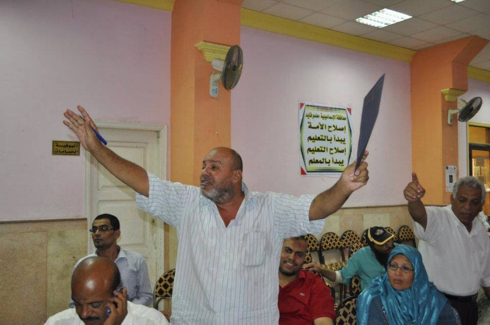 معاون وزير التعليم وعضو مكتب متابعة وكيل وزارة التربية والتعليم بالقليوبيةحيث قال انا ادعواجميع اعضاء الجمعية العمومية لمجلس النقابة العامه للمعلمين .. أن يحذو حذو نقابة المهندسين ويتبعوا نفس الاجراءات . لاعادة النقابة العامة للمعلمين الى اصحابها الحقيقين وأطالب رؤساء النقابات الفرعية بتقديم طلب لمجلس النقابة العامة للموافقة على عقد جمعية عمومية لكل معلمين مصر وليس لاعضاء النقابات الفرعيةلنقول كلمتنا ونطالب بتعديل قانون النقابة العقيم الذى يشترط فى(مادتة التاسعة ) أن يكون عضو النقابة متمتعا بجنسية الجمهورية العربيةالمتحدة .وفى (المادة 48 )يشترط في عضو مجلس إدارة اللجان النقابية والنقابات الفرعية والنقابة العامة أن يكون متمتعا بجنسية الجمهورية العربية المتحدة ومن الأعضاء العاملين في الاتحاد الاشتراكي العربيوأين مجلس النقابة من المادة ( 17 ) التى تنص على ان ينشأ فى الامانة العامه ملف خاص بكل عضو توضع فية استمارة وجميع الاوراق التى تخص هذا العضو ويجوز أن تنشئ النقابات الفرعية واللجان النقابية ملفات لأعضائها كذلك ,توضع فيها جميع الأوراق التي تتصل بالتصرفات الخاصة بالعضو ,من قبول عضويته أو نقل مقر إقامته ,أو بحث في شكواه أو أي تصرف من التصرفات المتعلقة به ,كمنحه إعانة أو معاش أو إحالته إلى مجلس تأديب ,أو تقرير عقوبة له والمادة 53 ) التى تنص ايضاإذا فقد أحد أعضاء مجلس الإدارة شرطا من شروط العضوية سقطت عضويته وأصدر المجلس قرارا بذلك وللمجلس أن يقرر إسقاط عضوية من يتغيب عن حضور جلساته ثلاث مرات متتالية خلال السنة الواحدة بغير عذر يقبله المجلس وذلك بعد إخطار العضو بالحضور لسماع أقواله وللعضو حق الطعن أمام محكمة القضاء الإداري الذي يصدر بإسقاط عضويته لذلك اطالب الجمعية العمومية لانتخاب نقيبيمثلنا امام الجهات القضائيـــــــــــة كمـا تنص على ذلك ( المادة 51 ) يمثل النقيب النقابة أمام جهات القضاء والإدارة وأمام الغير أما النقابة الفرعية واللجنة النقابية فيمثلهما رئيسهما أما الجهات المذكورة في حدود اختصاصيهما )