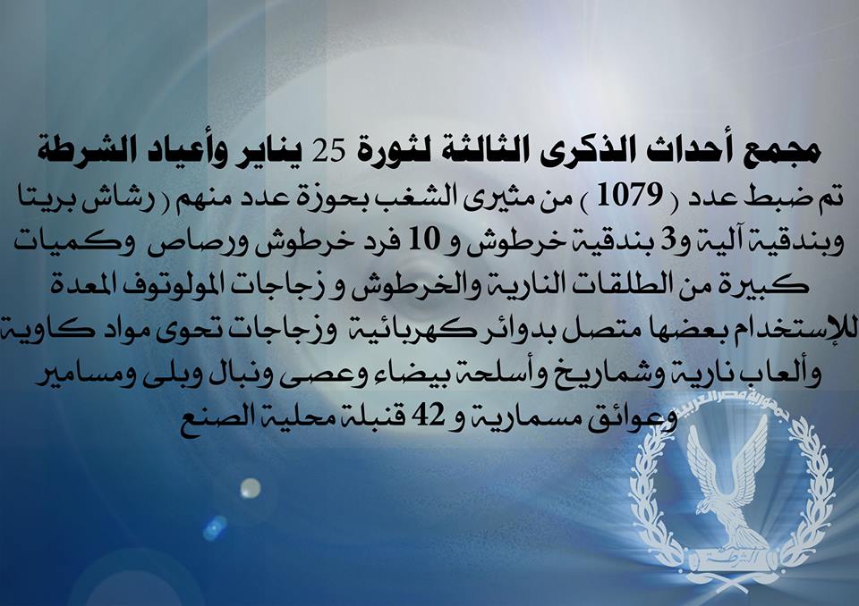 – تمكنت قوات الشرطة من مواجهة كافة المسيرات وأحبطت محاولات تأثيرها على مظاهر الإحتفال بمختلف الميادين الحيلولة دون تعدى المشاركين فيها على الأهالى وتفريقهم وضبط عدد ( 1079 ) من مثيرى الشغب بحوزة عدد منهم ( رشاش بريتا وبندقية آلية و3 بندقية خرطوش و 10 فرد خرطوش ورصاص وكميات كبيرة من الطلقات النارية والخرطوش و زجاجات المولوتوف المعدة للإستخدام بعضها متصل بدوائر كهربائية وزجاجات تحوى مواد كاوية وألعاب نارية وشماريخ وأسلحة بيضاء وعصى ونبال وبلى ومسامير وعوائق مسمارية و 42 قنبلة محلية الصنع ).
