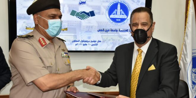 إستمراراً لحرص القيادة العامة للقوات المسلحة على دعم المنظومة التعليمية بالجامعات المصرية وتبادل الخبرات العلمية وتحقيق أقصى درجات التعاون المثمر فى شتى المجالات تم توقيع بروتوكول تعاون بين كلية الهندسة جامعة عين شمس والهيئة الهندسية للقوات المسلحة للإستفادة من خبراتها العملية والتطبيقية فى تنفيذ المشروعات بإعتبارها بيت خبرة فى العديد من المجالات والتخصصات الهندسية ، وذلك بحضور اللواء أ ح / إيهاب محمد الفار رئيس الهيئة الهندسية للقوات المسلحة والأستاذ الدكتور / محمود المتينى رئيس جامعة عين شمس وعدد من أعضاء هيئة التدريس .