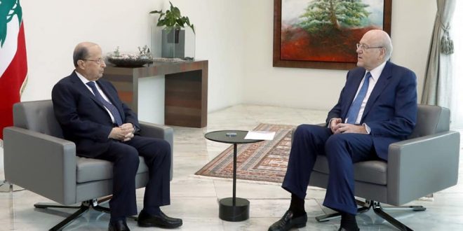 جاء ذلك أثناء انعقاد اللقاء الرابع عشر بين عون وميقاتي في قصر الرئاسة وذلك منذ تكليف ميقاتي بتشكيل الحكومة في السادس والعشرين من شهر يوليو الماضي.