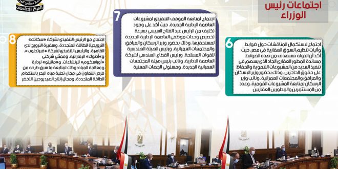 كما شملت الاجتماعات أيضاً كما أظهر التقرير، اجتماعاً لاستكمال المناقشات حول ضوابط وآليات تنظيم السوق العقارية في مصر، حيث أكد أن الدولة تستهدف من هذه الضوابط مساندة المطور العقاري الجاد الذي يسهم في تنفيذ العديد من المشروعات التنموية والحفاظ على حقوق الحاجزين، وذلك بحضور وزير الإسكان والمرافق والمجتمعات العمرانية، ونائب وزير الإسكان لمتابعة المشروعات القومية، وعدد من المستثمرين والمطورين العقاريين، في حين ترأس سيادته الاجتماع الأسبوعي، حيث تم مناقشة عدد من الملفات المهمة مثل كلمة الرئيس عبد الفتاح السيسي أمام قمة مصر والدول الأعضاء في تجمع فيشجراد، ومستجدات الوضع الحالي لفيروس كورونا، وكذلك اجتماع لمتابعة الموقف التنفيذي لمشروعات العاصمة الإدارية الجديدة، حيث أكد على وجود تكليف من الرئيس عبد الفتاح السيسي بسرعة تخصيص وحدات موظفي العاصمة الإدارية الجديدة لمستحقيها، وذلك بحضور وزير الإسكان والمرافق والمجتمعات العمرانية، ورئيس الهيئة الهندسية للقوات المسلحة، ورئيس القطاع الهندسي لشركة العاصمة الادارية، ونائب رئيس هيئة المجتمعات العمرانية الجديدة، ومسئولي الجهات المعنية، بالإضافة إلى اجتماع مع الرئيس التنفيذي لشركة “سكاتك” النرويجية للطاقة المتجددة، وسفيرة النرويج لدى القاهرة، والرئيس التنفيذي لشركة “فيرتجلوب”، و”أدنوك” الإماراتية، وممثلي شركتي “أوراسكوم” للإنشاءات، و”ماتيتو” لإدارة ومعالجة المياه؛ وذلك لمتابعة ما سبق طرحه من فرص للتعاون في مجال تحلية مياه البحر باستخدام الطاقة المتجددة، ومجال إنتاج الهيدروجين الأخضر، بجانب اجتماع لمتابعة تنفيذ التكليفات الرئاسية بشأن الالتزام بالمعايير الأوروبية في السلع والمنتجات المستوردة، والعمل على حوكمة منظومة الاستيراد، وذلك بحضور وزيرة التجارة والصناعة، ورئيس هيئة الدواء المصرية، ونائب وزير المالية للخزانة العامة، ورئيس الهيئة المصرية العامة للمواصفات والجودة، ورئيس الهيئة القومية لسلامة الغذاء، ورئيس مصلحة الجمارك، ورئيس قطاع مكتب وزير الصحة، ورئيس الإدارة المركزية للحجر الزراعي.