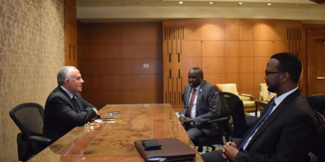 على هامش فعاليات اسبوع القاهرة الرابع للمياه .. عقد الدكتور محمد عبد العاطى وزير الموارد المائية والرى لقاءاً مع ماناوا بيتر وزير الموارد المائية والرى بدولة جنوب السودان ، وسعيد حسين عيد وزير الزراعة والثروة الحيوانية والمراعي والغابات الصومالي والذى استعرض سبل تعزيز مجالات التعاون بين الدول الثلاث فى مجال المياه.