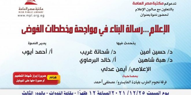 تنطلق في الثانية عشر, ظهر غدا السبت, فعاليات “صالون الاعلام” الشهري, والتي تقام تحت عنوان “رسالة البناء في مواجهة مخططات الفوضي”, بمكتبة مصر العامة, بحضور كوكبة من الاعلاميين والصحفيين والرموز الوطنية.