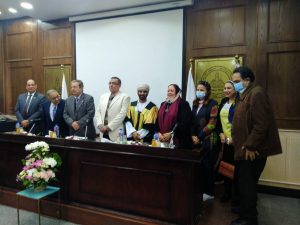 وتكونت لحنة الحكم والمناقشة من الدكتور محمود عبدالهادي, أستاذ التمويل بالكلية, والدكتورة جيهان عبدالمنعم رجب, أستاذ التسويق بالكلية, والدكتور محمد لطفي وهدان, الأستاذ المساعد بقسم ادارة الأعمال, الي جانب الدكتور صفوت النحاس, رئيس الجهاز المركزي للتنطيم والادارة سابق.