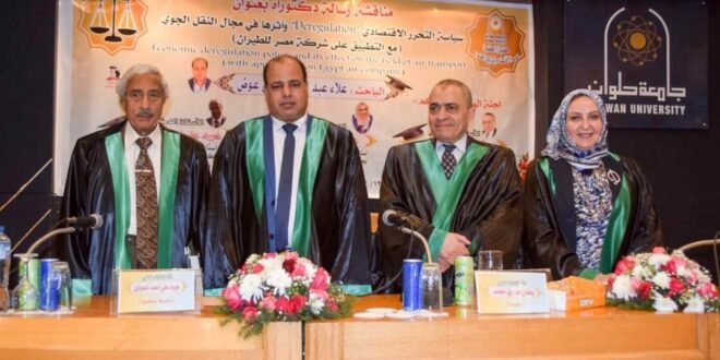 منحت كلية الحقوق, جامعة حلوان, الباحث علاء عبد الرحيم الهرس, درجة الدكتوراه فى الحقوق ، عن رسالته بعنوان (سياسه التحرر الاقتصادى Dergulation واثرها فى مجال النقل الجوى – مع التطبيق على شركة مصر للطيران) بتقدير عام جيد جدا مع مرتبة الشرف.