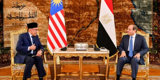 كما تم التباحث بشأن تطورات الأوضاع في المنطقة، لاسيما في ظل التصعيد العسكري الجاري بقطاع غزة، حيث استعرض السيد الرئيس في هذا الإطار النتائج التي انبثقت عن المناقشات خلال قمة القاهرة للسلام، وتم التوافق بين مصر وماليزيا بخصوص ضرورة تنسيق الجهود لوقف التصعيد وتحقيق التهدئة، فضلاً عن توفير الحماية اللازمة للمدنيين الفلسطينيين. كما أكد الجانبان ضرورة الاستمرار في توفير النفاذ الآمن والعاجل للمساعدات الإنسانية إلى أهالي القطاع، حيث أشاد رئيس الوزراء الماليزي بالجهود المصرية المكثفة في هذا الصدد. وأعرب الزعيمان أيضاً عن القلق من خطورة اتساع رقعة العنف إلى المنطقة، مع التشديد على الرفض التام لتصفية القضية الفلسطينية من خلال فكرة التهجير القسري لأهالي غزة، وتأكيد أن المخرج الوحيد للوضع المتأزم الراهن هو تكاتف المجتمع الدولي للعمل على إيجاد الحل العادل والشامل للقضية الفلسطينية على أساس حل الدولتين وفق مرجعيات الشرعية الدولية، بما يحفظ الحقوق المشروعة للشعب الفلسطيني.