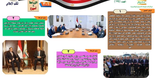 أصدر مركز المعلومات الصوتية والمرئية، التابع لوزارة الزراعة واستصلاح الاراضي، “الانفوجراف الاسبوعي” في نسخته رقم ١٧٥ ، حول الحصاد الاسبوعي لأهم أنشطة الوزارة، خلال الاسبوع الماضي في الفترة من ٢٢ وحتى ٢٨ ديسمبر الجاري الجاري، وذلك بالتعاون مع المكتب الاعلامي للوزارة، كما أصدر المركز ايضا ملخصا بالفيديو، حول انشطة الوزارة خلال نفس الفترة.