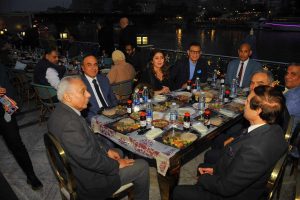 وفي بداية حفل الإفطار قام الدكتور حسن عماد مكاوي رئيس مجلس إدارة الجمعية، يرافقه الدكتور سامي الشريف نائب رئيس الجمعية, والمستشار عبدالعظيم صدقي أمين عام الجمعية وأعضاء مجلس الإدارة بالترحيب بالسادة ضيوف حفل الإفطار الذي أقيم علي ضفاف النيل الخالد، وساده جو من البهجة والسعادة والروحانيات الرمضانية, حيث أكد الدكتور حسن عماد أن حفل الإفطار السنوي للجمعية يعد فرصة للقاء الزملاء والأصدقاء من عمداء وأساتذة الإعلام والإعلاميين والصحفيين وخريجي الإعلام من الدفعات المختلفة علي مائدة واحدة يسودها الود والألفة وتبادل الخبرات بين الأجيال المختلفة من خريجي الإعلام وهو الأمر الذي يحرص عليه مجلس الإدارة.