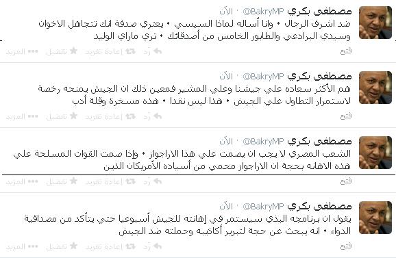 وأضاف بكري “هل يجوز لهذا الأراجواز أن يهين جيشنا بهذه الطريقة ، والغريب أنه يقول أن برنامجه البذئ سيستمر في إهانته للجيش أسبوعيا حتى يتأكد من مصداقية الدواء ، أنه يبحث عن حجة لتبرير أكاذيبه وحملته ضد الجيش ” .