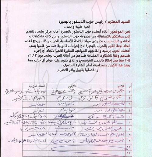 تقدم عدد 13 عضواً من أعضاء حزب الدستور برشيد بالبحيرة بإستقالة جماعية من الحزب اعتراضاً على ما وصفوه بالتجاهل والتقاعس من قبل لجنة القيم بالحزب عن البت في شكواهم ضد بعض أعضاء الحزب بدمنهور والذين قاموا بسب أعضاء الأمانة برشيد عبر موقع التواصل الإجتماعي “فيس بوك” داخل المجموعات الخاصة بأعضاء الحزب بالبحيرة .