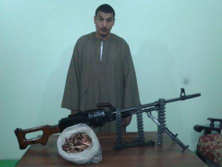فقد تم ضبط ” محمد . س . ع ” , 30 عاماً , موظف , مقيم بالغنايم قبلى و بحوزته رشاش جرينوف عيار خالى من و غطاء الأجزاء من الخلف – 340 طلقة من ذات العيار و 5 شريط لذات السلاح .