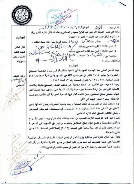 وجهت الحملة الموحدة لسحب الثقة من نقيب المحامين ومجلس النقابة ذو الغالبية الاخوانية انذار رسمى اليوم للنقابة العامة حول مطالب الحملة بشأن الجمعية العمومية الطارئة لنقابة المحامين المزمع عقدها في يوم الجمعة السابع والعشرين من يونيو الجاري حرصاً من الحملة على خروج الجمعية العمومية الطارئة للمحامين المقرر عقدها للنظر في شأن سحب الثقة من نقيب ومجلس نقابة المحامين بالمظهر الحضاري اللائق لنقابة المحامين ولرسالة المحاماة ، وتدعو جميع الزملاء المؤيدين لسحب الثقة والرافضين له الى أن تسري روح الحب والمودة والزمالة والإخاء والتضامن المعتادة بين