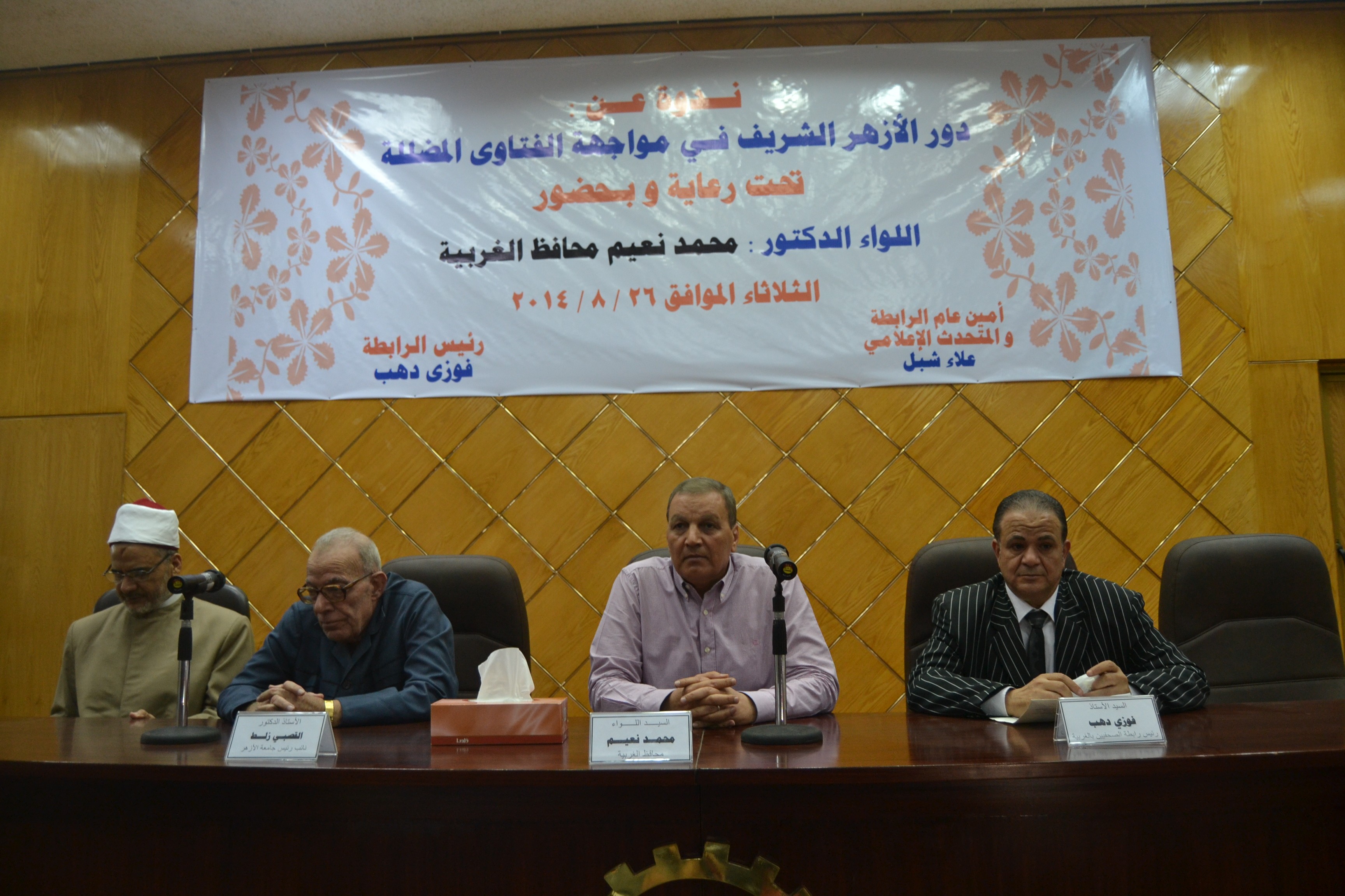 شهدت قاعة المجلس المحلي بطنطا بمحافظة الغربية فعليه لندوة دينية نظمها رابطة الصحفيين و المراسلين بالغربية بعنوان ” دور الأزهر الشريف في مواجهة الفتاوى المضللة ” تحت رعاية وبحضور اللواء محمد نعيم محافظ الغربية والشيخ عبد الرحمن حبسة وكيل وزارة الأوقاف بالغربية بمقر المجلس المحلى للمحافظة .