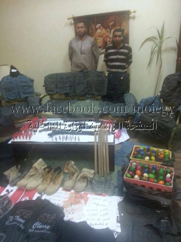 ” بندقية خرطوش – 4 فرد خرطوش – بندقية رش – 122 طلقة خرطوش العيار – 19 طلقة آلية – 13 صديرى واقى من الرصاص ” أحدهم مستولى عليه من إحدى سيارات الشرطة التى قاموا بإحراقها والمحر عنها المحضر اللازم ” و 4 أحذية كانوا يرتدونها خلال تصوير مقطع الفيديو “.
