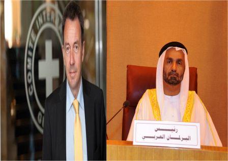 التقى صباح اليوم الأربعاء ، وفد رفيع المستوى من البرلمان العربي برئاسة معالى الرئيس “أحمد بن محمد الجروان”، بالسيد “بيتر ماورير” رئيس اللجنة الدولية للصليب الأحمر، ضمن مجموعة من اللقاءات يجريها الوفد مع الهيئات والمنظمات الدولية بسويسرا، حول تداعيات العدوان الصهيوني على الشعب الفلسطيني في غزة.