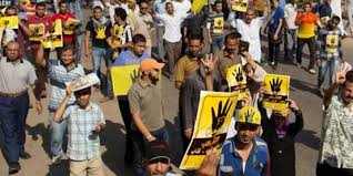 ورفع المشاركون فى التظاهرات لافتات تحمل شعار رابعة وصوراً للرئيس المعزول، وسط هتافات التنديد بالرئيس عبدالفتاح السيسي، واللواء محمد إبراهيم، وزير الداخلية .