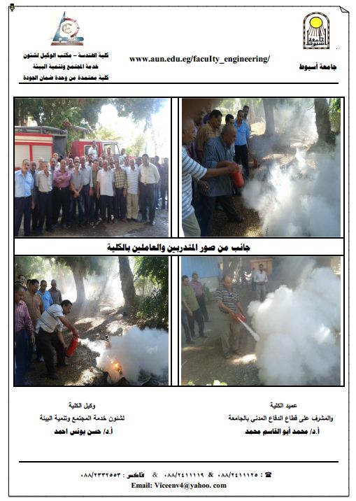 استمراراً لاهتمام كلية الهندسة جامعة أسيوط بالمحافظة على أفرادها و منشآتها، و توفير بيئة ملائمة لأنشطتها المختلفة و ذلك ضمن منظومة الجامعة في هذا الشأن نظمت إدارة الحماية المدنية بالتعاون مع قطاع خدمة المجتمع و تنمية البيئة بكلية الهندسة بعقد دورة تدريبية للفنيين بالكلية على استخدام أجهزة الإطفاء بمركز تطوير التعليم الهندسي بالكلية لضمان تأمين المنشآت الجامعية .
