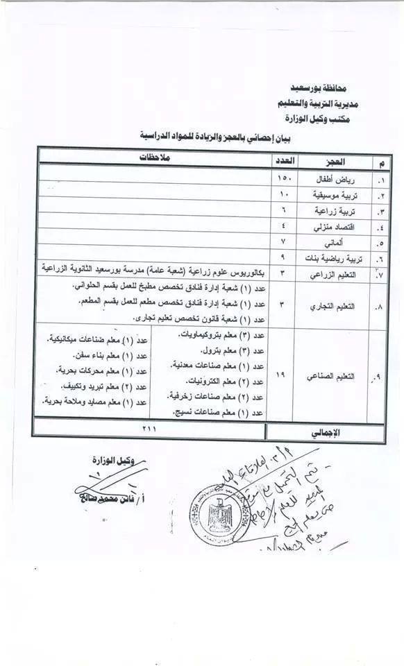 واشار بيان المديرية الى أن الحصر المقدم من المديرية يوضح أن العملية التعليمية ببورسعيد تحتاج الى معلمين فى رياض الأطفال ومدرسى اللغة الألمانية والتعليم الصناعى والتجارى فقط .