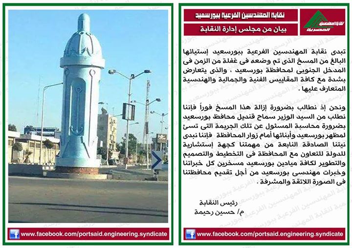 على جانب أخر وصفت نقابة المهندسين الفرعية ببورسعيد ذلك المجسم بالمسخ وأصدرت بيانها برفضها لذلك المجسم الغريب بمدخل المحافظة والذى تم بناؤة فى غفلة من الزمن والذى يعد بناؤة ايضا اهدار للمال العام طالما لا يعطى أى مظهر جمالى للمحافظة على العكس هو يشوه المظهر الجمالى للمدينة الباسلة