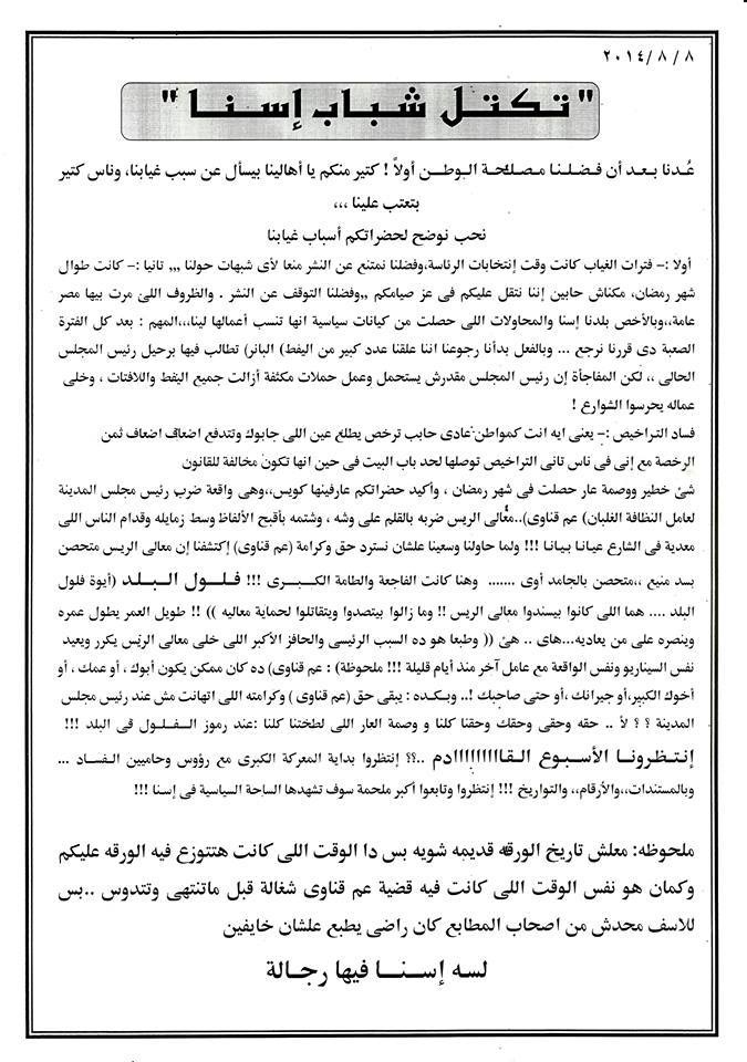 قامت حركة ” تكتل شاب إسنا ” بمركز ومدينة إسنا جنوب محافظة الاقصر ، بعد صلاة الجمعة اليوم، بتوزيع منشورات علي الأهالي والمصلين بعد خروجهم من المساجد .