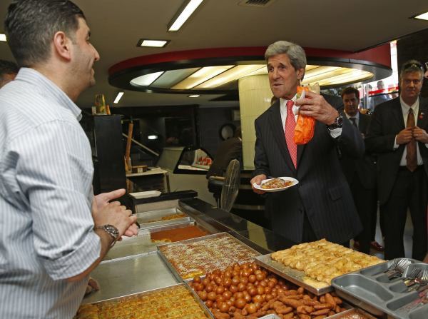 ترك وزير الخارجية الأمريكي جون كيري المسار الدبلوماسي اليوم الخميس وخرج إلى أحد شوارع الضفة الغربية حيث تناول شطيرة شاورمة وكنافة فلسطينية بالفستق.
