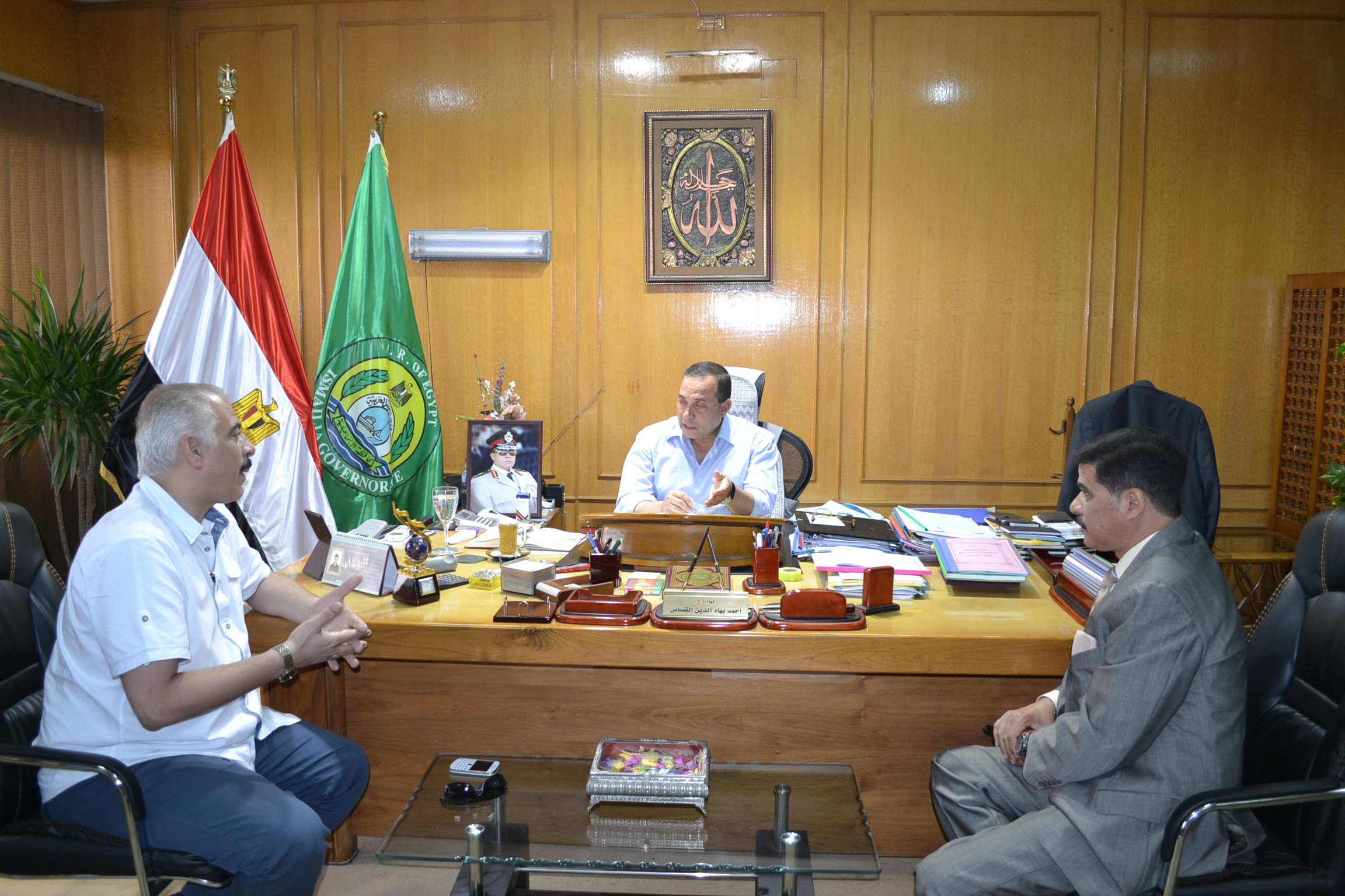 إستقبل اللواء احمد القصاص محافظ الاسماعيلية بمكتبه الاستاذ الدكتور عمرو قنديل رئيس قطاع الطب الوقائى بوزارة الصحة والسكان يرافقه الدكتور هشام الشناوى وكيل وزارة الصحة بالاسماعيلية وذلك خلال الزيارة التى قام بها رئيس قطاع الطب الوقائى بوزارة الصحة لمحافظة الاسماعيلية وموقع مشروع حفر قناة السويس الجديدة على رأس وفد من قطاع الطب الوقائى بالوزارة بضم ممثلى الادارات العامة لصحة البيئة ومراقبة الاغذية والرصد البيئى والصحة المهنية وناقلات الامراض ومكافحة الامراض المعدية .