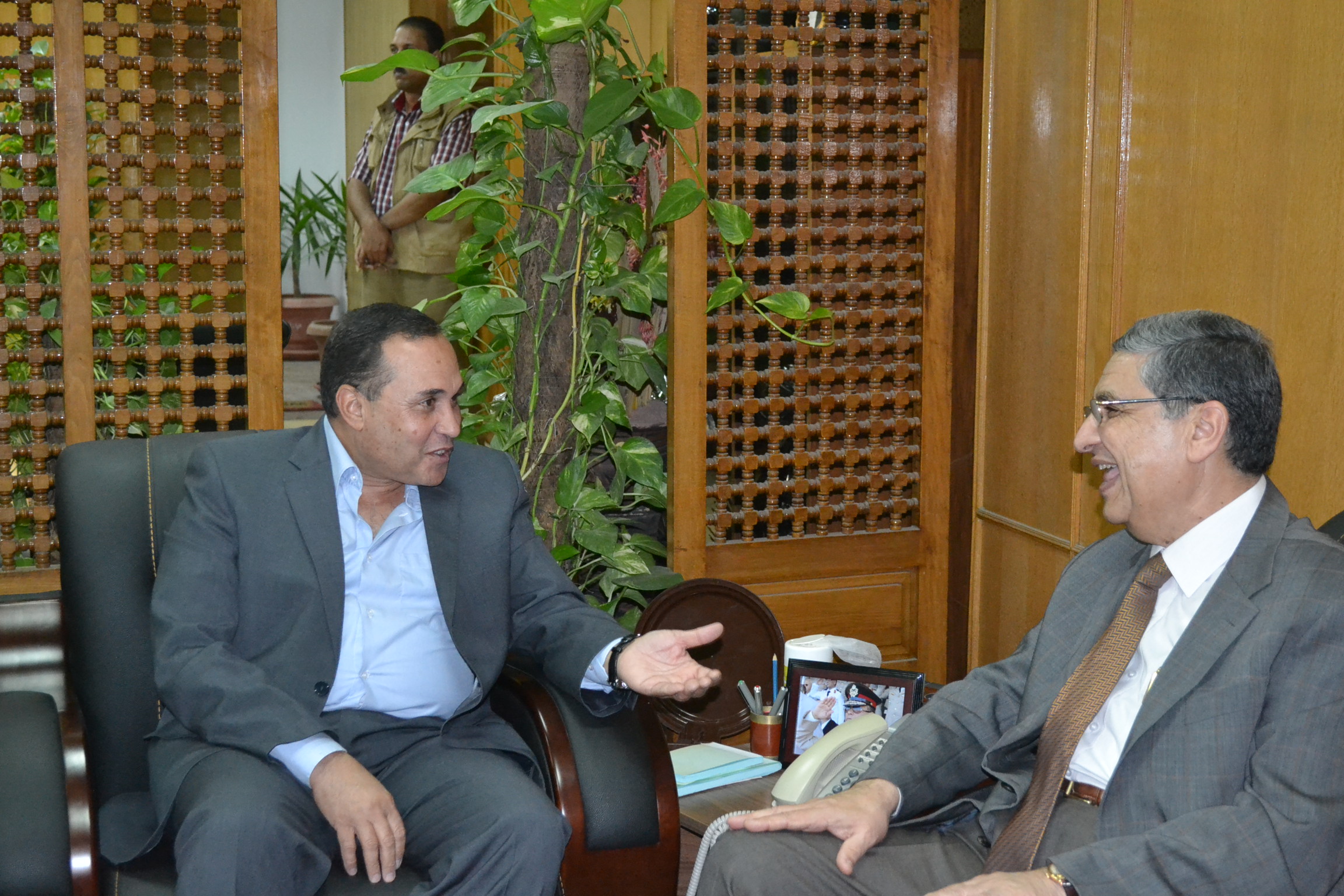 أستقبل اللواء أحمد القصاص محافظ الإسماعيلية بمكتبه بديوان عام المحافظة الدكتور محمد شاكر وزير الكهرباءوالطاقة والوفد المرافق له من قيادات الوزارة خلال الزيارة التى قام بها وزير الكهرباء لمحافظة الاسماعيلية والتى تضمنت الألتقاء بالفريق مهاب مميش رئيس هيئة قناة السويس وزيارة موقع مشروع حفر قناة السويس الجديدة والالتقاء بالعاملين بالمشروع واستعراض المخطط العام للمشروع وما تم تنفيذه من أعمال الحفر والتكريك بالقناة الجديدة.