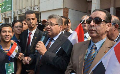 وقام الطلاب برفع علم مصر وسط جو من الفرحة والبهجة بين العمداء بالكلية الذين رفعوا علامة النصر.