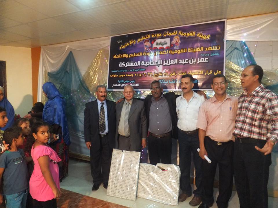 أقيمت مساء أمس بقاعة نقابة المعلمين بمدينة القصير حفل تكريم لمدرسة عمر بن عبد العزيز الإعدادية لحصولها على الجودة و الإعتماد تحت رقم 29 بتاريخ 26/6/2014 و لمدة 5 سنوات ،