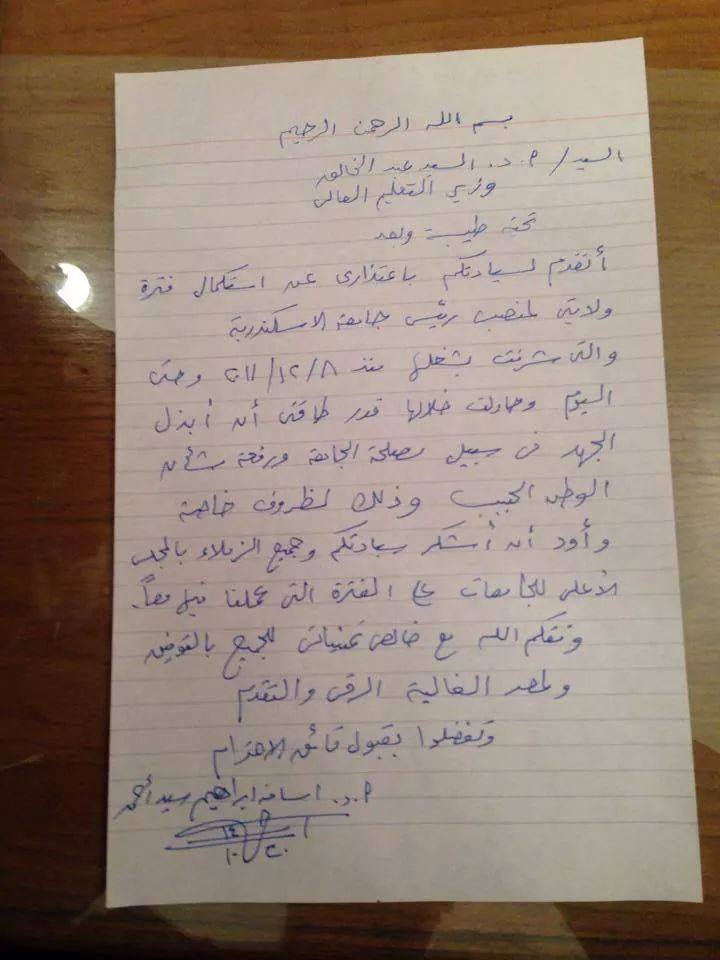 تفاجأت الأوساط الإعلامية وقيادات جامعة الإسكندرية بقيام الدكتور إسامة إبراهيم رئيس جامعة الإسكندرية بتقديم استقالته عن رئاسة الجامعة، عقب قيامه بعقد مؤتمر صحفي يوضح فيه ملابسات أزمة مستشفى الطوارئ والأطفال بسموحة، وللرد على أسئلة الصحافة والإعلام بالمحافظة، دون الإعلان عن قيامه بتقديم استقالته.