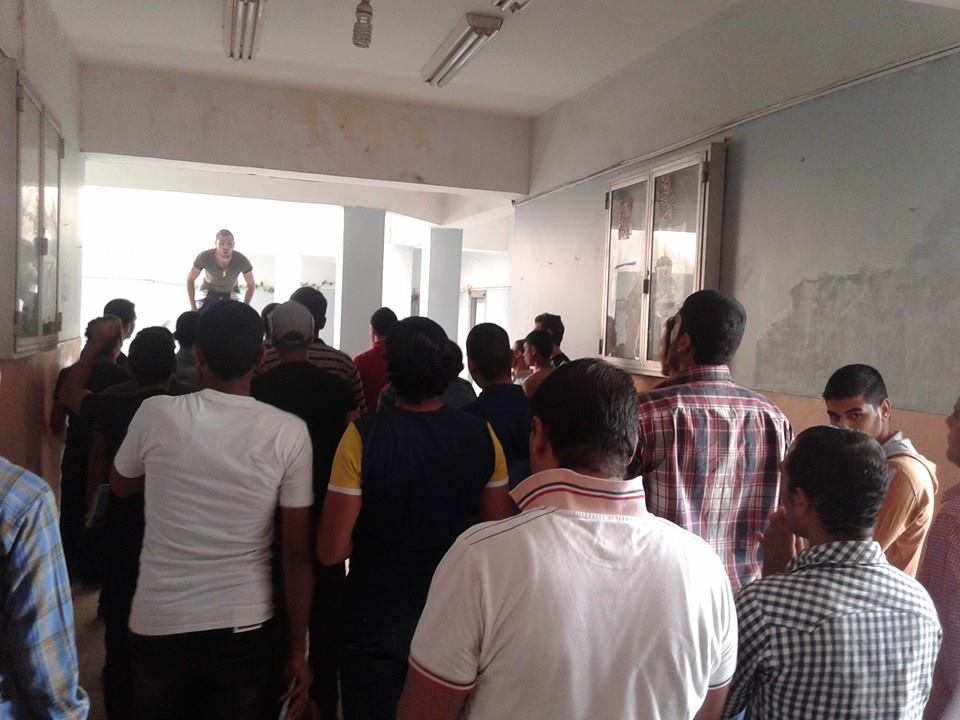مرددين هتافات مسيئة للجيش والشرطة والقضاء، وقد رفع المشاركون لافتات بأسماء زملائهم وإشارات رابعة الصفراء، وصور للمعزول، داخل الحرم الجامعى.