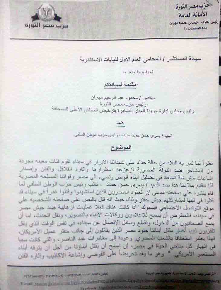 تقدم اليوم حزب مصر الثورة برئاسة المهندس محمود مهران ببلاغاً للمحامى العام الأول لنيابات الإسكندرية ضد القيادى السلفي الدكتور يسري حماد نائب رئيس حزب الوطن السلفي بسبب تصريحاته بان ما يحدث في سيناء مسرحيه وان الجنود الذين استشهدوا فى سيناء قد قتلوا في ليبيا .