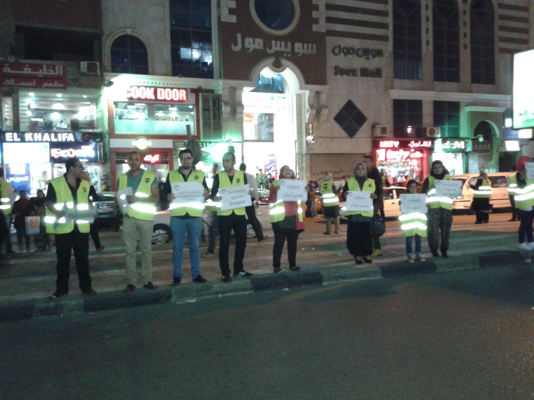 حيث ظهر أعضاء الحزب بشكل منظم على جانبي الطريق رافعين لافتات ” مستقبلنا بدون إرهاب ” و ” الارهاب لا دين له ” و ” لا للارهاب ” و ” أنا مسلم ضد الارهاب ” ، وقاموا ارتداء الشارة السوداء على اكتافهم
