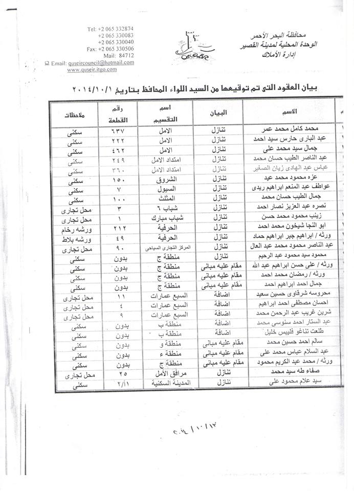 كما تهيب الوحدة المحلية لمدينة القصير المواطنين للتوجه لإدارة الأملاك لإستلام العقود .