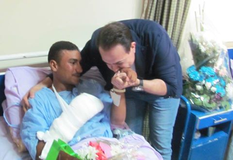 وأبلغ حكيم المصابين عن تقدير الشعب بأكمله للموقف البطولي لهم في حماية امن الوطن الغالي ، وختم زيارته بأغنية بتسلم الأيادى .