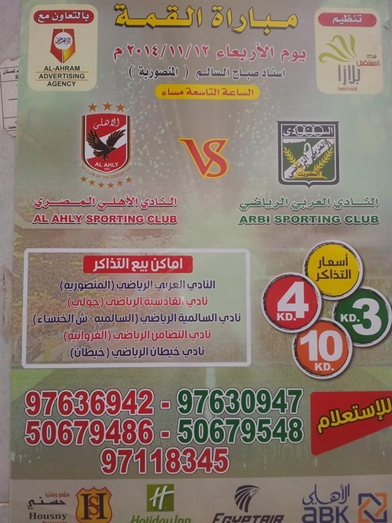 طرح مسئولو فريق العربي الكويتي تذاكر مباراته الودية أمام فريق النادي الأهلي المصري والمقرر إقامتها في الثاني عشر من نوفمبر المقبل بالكويت.