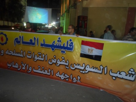 نظم ائتلاف القوى السياسية والشعبية والشبابية و اتحاد الشباب الناصري و ممثلين عن مختلف الأحزاب في السويس وقفة صامته فى ميدان الأربعين ضد الإرهاب و لمؤازرة القوات المسلحة و الشرطة في تصديها لكافة أشكال الإرهاب رافعين لافتات مدون عليها ” ارادة الشعب أقوى من الإرهاب ” و ” شعب السويس يفوض القوات المسلحة و الشرطة لمواجهة الإرهاب ” .
