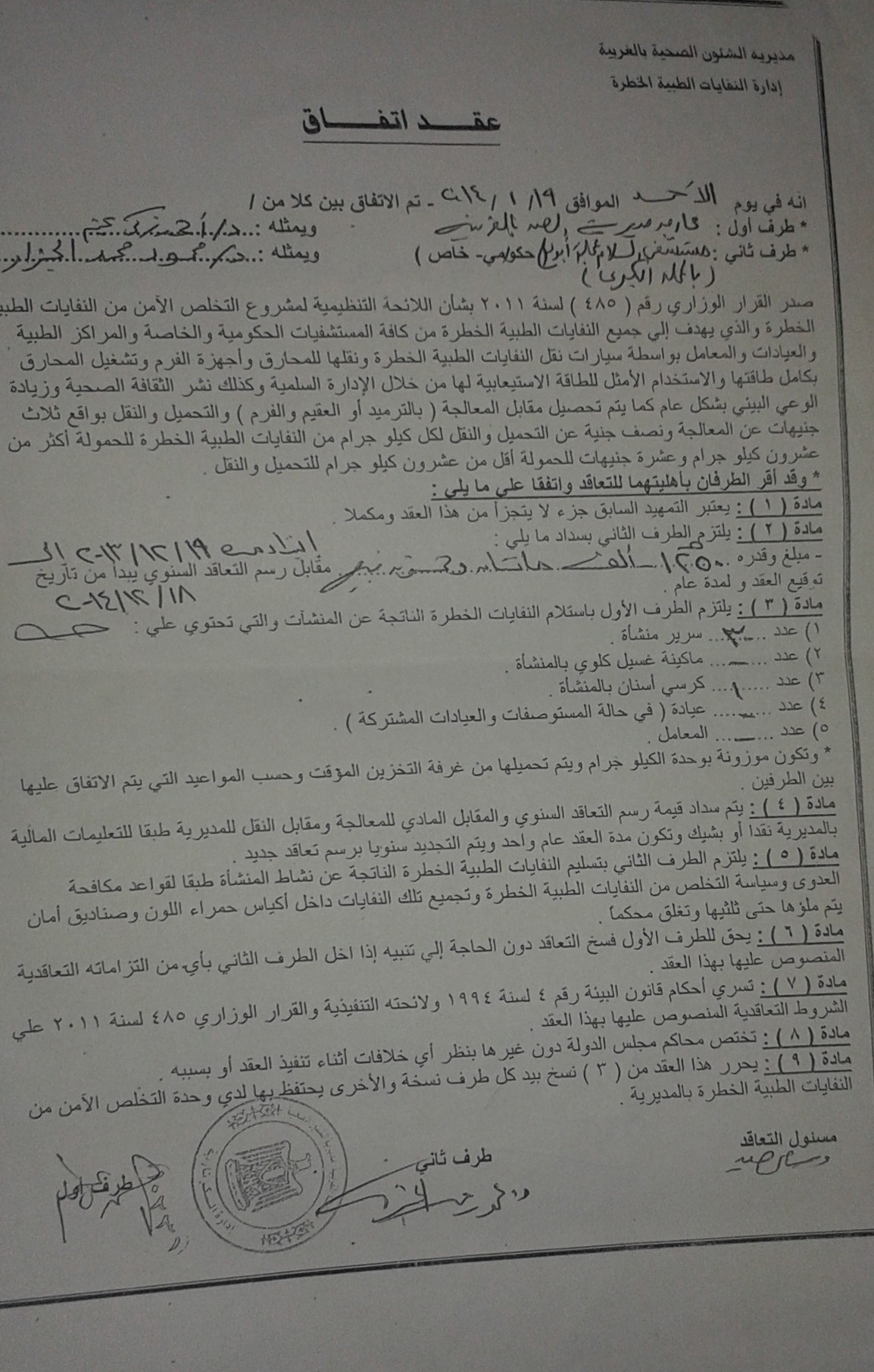 وأكد احد المصادر الطبية داخل المستشفى إن حتى ألان لم يتم صيانة الجهاز أو استبداله بجهاز أخر كما أشار إن المستشفى كانت متعاقدة مع مديرية الصحة بالغربية الإزالة النفايات الخاصة بالمستشفى طوال فتره العقد بين المستشفى المديرية لم تقوم المستشفى بإخراج اى نفايات للمديرية بل كانت المستشفى تبيع هذه النفايات بكيلو بسوق السوداء .