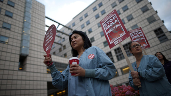 وبدأ حوالي 19 ألف ممرض وممرضة يوم الثلاثاء إضراباً لمدة يومين، في إطار احتجاجات على إجراءات التصدي للإيبولا، ويحث الممرضون والممرضات المستشفيات على شراء ملابس واقية من الفيروسات وأجهزة لتنقية الهواء لحمايتهم من التعرض للفيروس.