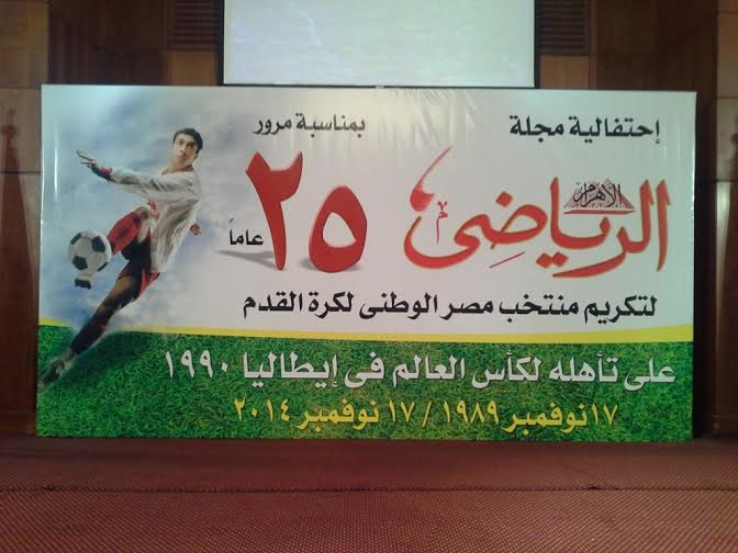 كرم المهندس خالد عبد العزيز، وزير الشباب والرياضة، والدكتور خالد توحيد، رئيس تحرير مجلة الاهرام الرياضى، أعضاء منتخب مصر الوطني لكرة القدم الذي تأهل لكأس العالم في إيطاليا 1990، وذلك بمناسبة مرور 25 عاماً على تأهله “17 نوفمبر 1989 / 17 نوفمبر 2014”.