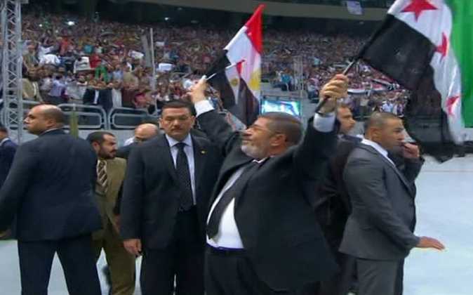 مرسى يحى الحاضرين بأستاد القاهرة بالعلمين المصرى والسورى 15 يونيو، 2013 186 زيارة مرسى يدخل القاعة المغطاة بأستاد القاهرة وهو يمسك العلم السورى بجانب العلم المصر ويلقى التحية بهم على الحاضرين. تقدم الرئيس محمد مرسي بالتحية للحضور أثناء دخول القاعة المغطاة وقام بالإمساك بالعلم السوري بجانب العلم المصري.