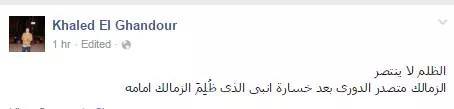 خالد الغندور: انهزم الظلم فتصدر الزمالك 29 ديسمبر، 2014 190 زيارةنشر خالد الغندور علي صفحتة “فيس بوك”متكلماً عن ظلم الزمالك في الدوري العام من قبل حكامة”أضاف كلماتة : الظلم لاينتصر الزمالك تصدر الدوري بعد خسارة أنبي الذي ظلم الزمالك أمامة.