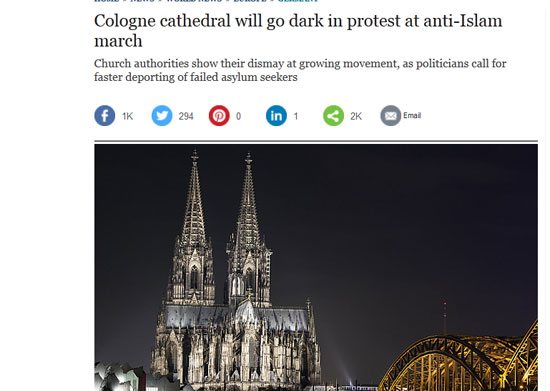 قرر القائمون على كاتدرائية “كولونيا” الألمانية الشهيرة إطفاء أضوائها الكاشفة، كاحتجاج على تنامى المسيرات المعادية للإسلام والمهاجرين فى ألمانيا مؤخرا، حسب ما نشر موقع صحيفة التليجراف.