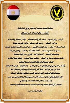 بمناسبة عيد الشرطة و ذكرة ثورة يناير يبعث اللواء محمد ابراهيم وزير الداخلية برسالة إلى رجال الشرطة تنص على :