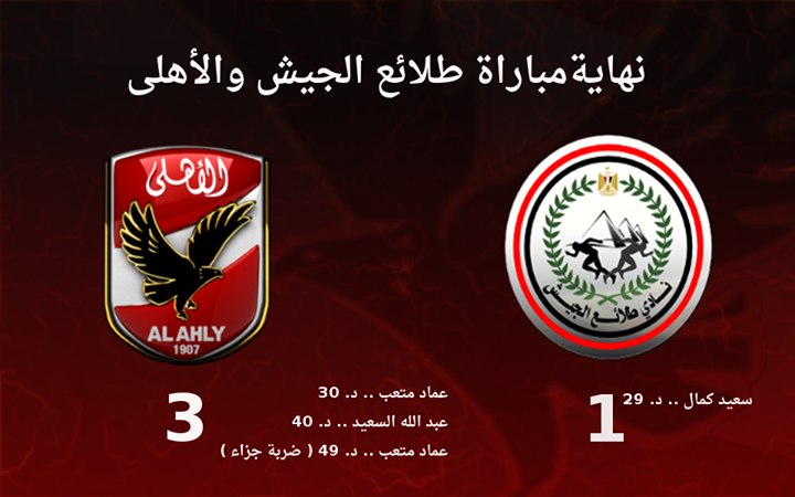 استطاع نجوم النادي الاهلي تحقيق فوزا غاليا علي طلائع الجيش بنتيجة 3-1 يرف بها رصيده ل 32 نقطة يحتل بها المركز الرابع قبل لقاء القمة المحدد له 29 الجاري.